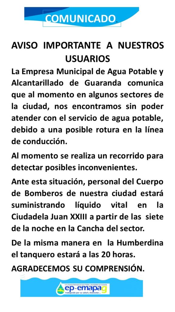 Con el objetivo de garantizar la calidad del agua que consumen los habitantes de este importante sector de nuestra ciudad, la Empresa Municipal de agua potable y alcantarillado de Guaranda E-P EMAPA-G, ha llevado a cabo el análisis de agua en un punto de la red de abastecimiento. Cabe mencionar que se realizan periódicamente las